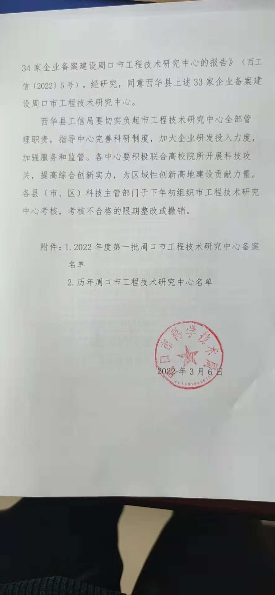 关于同意西华县备案建设2022年度第一批周口市工程技术研究中心的通知