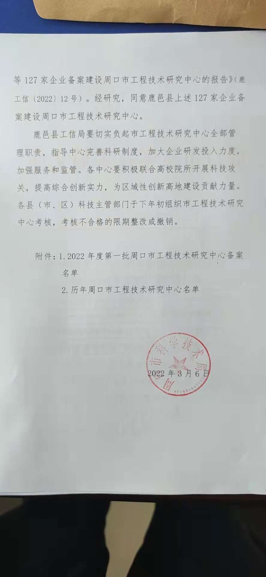 关于同意鹿邑县备案建设2022年度第一批周口市工程技术研究中心的通知